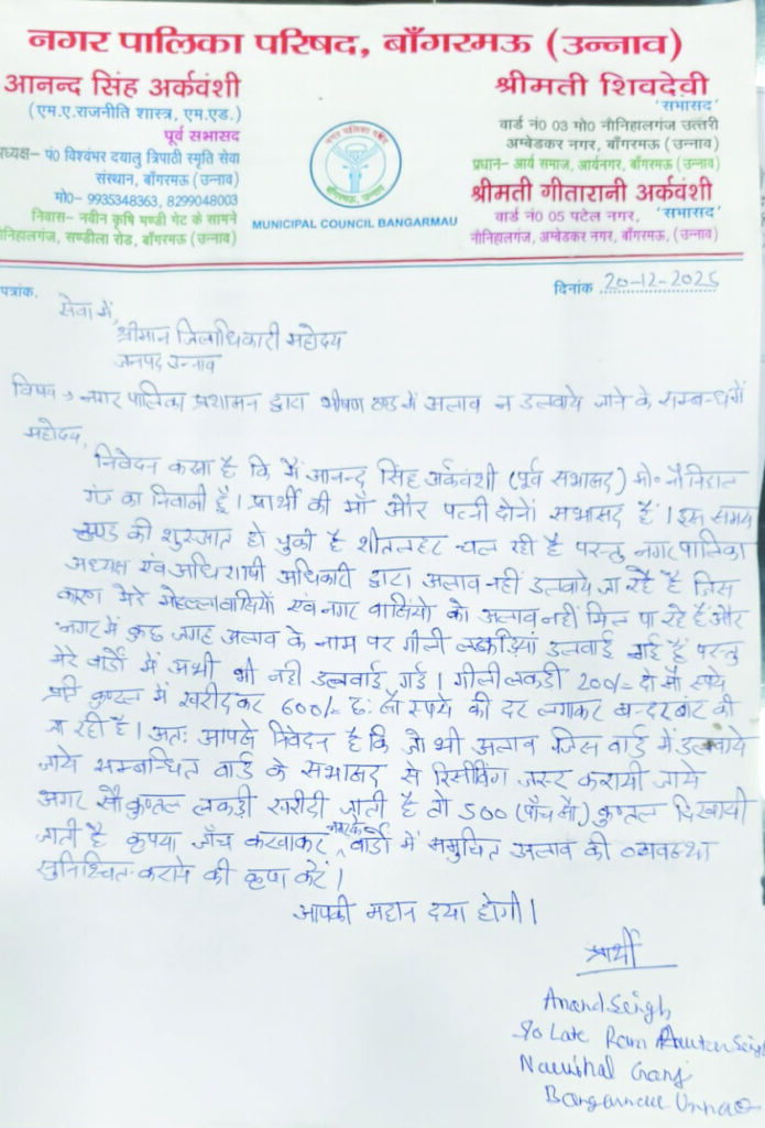 बांगरमऊ, उन्नाव। भीषण ठंड के प्रकोप से आमजन को राहत पहुंचाने के उद्देश्य से नगर पालिका प्रशासन द्वारा नगर के विभिन्न स्थानों पर अलाव जलाने के लिए बड़ी मात्रा में लकड़ी डलवाई गई है, लेकिन गीली लकड़ी होने के कारण अलाव ठीक से जल नहीं पा रहे हैं और लोगों को ठंड से अपेक्षित राहत नहीं मिल रही है। इस मामले को लेकर नगर पालिका के पूर्व सभासद आनंद सिंह अर्कवंशी ने जिला अधिकारी को पत्र लिखकर पालिका प्रशासन पर गंभीर भ्रष्टाचार के आरोप लगाए हैं। अपने पत्र में उन्होंने कहा है कि अलाव के लिए मात्र २०० रुपये प्रति कुंतल में खरीदी गई गीली लकड़ी का बिल ६०० रुपये प्रति कुंतल बनाकर सरकारी धन का दुरुपयोग किया जा रहा है। आनंद सिंह अर्कवंशी ने मांग की है कि अलाव के लिए लकड़ी डाले जाने के बाद संबंधित वार्ड के सभासद से उसका सत्यापन (वेरिफिकेशन) अनिवार्य रूप से कराया जाए, ताकि अनियमितताओं पर रोक लग सके। उन्होंने यह भी आरोप लगाया कि उनके वार्ड में अब तक अलाव के लिए लकड़ी नहीं डाली गई है, जिससे स्थानीय लोगों को भारी परेशानी का सामना करना पड़ रहा है। पूर्व सभासद ने जिलाधिकारी से मांग की है कि पूरे नगर में उपयुक्त स्थानों पर पर्याप्त और सूखी लकड़ी से अलाव जलाने के निर्देश दिए जाएं, ताकि कड़ाके की ठंड से आम नागरिकों को वास्तविक राहत मिल सके।