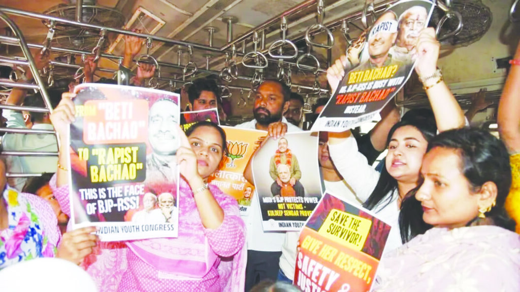 मुंबई। उन्नाव बलात्कार मामले में आरोपी और पूर्व भाजपा विधायक कुलदीप सेंगर की सजा निलंबित किए जाने के फैसले के विरोध में मुंबई युवक कांग्रेस ने तीखा आक्रोश जताया है। इस फैसले को महिलाओं के न्याय के साथ विश्वासघात बताते हुए युवक कांग्रेस ने मुंबई की लाइफलाइन कही जाने वाली लोकल ट्रेनों में एक अनोखा जन-जागरण अभियान चलाया। मुंबई युवक कांग्रेस की अध्यक्ष जीनत शबरीन के नेतृत्व में कार्यकर्ता सांताक्रुज से चर्चगेट तक लोकल ट्रेन में सफर करते हुए यात्रियों से सीधे संवाद में उतरे और उन्हें उन्नाव मामले की पृष्ठभूमि से अवगत कराया। इस दौरान प्रभारी पवन मजीठिया, प्रदेश महासचिव संतोष गुप्ता सहित कई पदाधिकारी मौजूद रहे। कार्यकर्ताओं ने आरोप लगाया कि सरकार पीड़िता को न्याय दिलाने के बजाय आरोपी को संरक्षण दे रही है। जीनत शबरीन ने भारतीय जनता पार्टी पर हमला बोलते हुए कहा कि ‘बेटी बचाओ, बेटी पढ़ाओ’ अब सिर्फ एक नारा बनकर रह गया है और सत्ता का दुरुपयोग कर बलात्कार के आरोपियों को बचाया जा रहा है। उन्होंने कहा कि उन्नाव मामला महिलाओं के प्रति भाजपा के असंवेदनशील रवैये को उजागर करता है। युवक कांग्रेस ने स्पष्ट किया कि यह आंदोलन केवल राजनीतिक विरोध नहीं, बल्कि महिलाओं की सुरक्षा और न्याय से जुड़ा सवाल है, और जब तक पीड़िता को पूर्ण न्याय नहीं मिलता, तब तक उनका संघर्ष सड़कों से लेकर लोकल ट्रेनों तक लगातार जारी रहेगा।