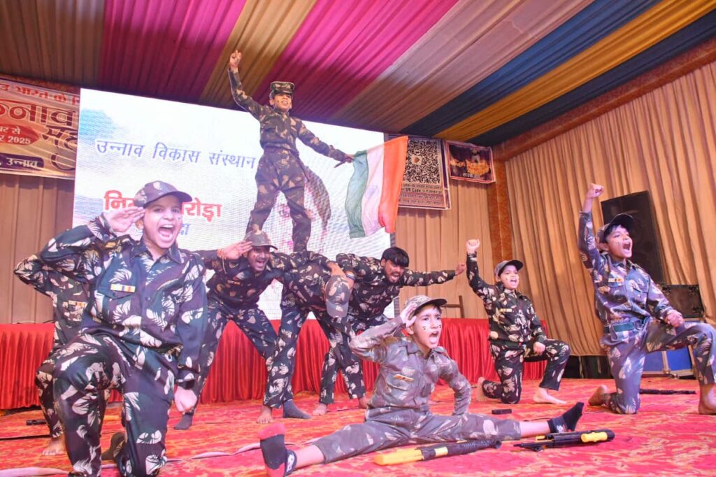 उन्नाव, उत्तर प्रदेश। उन्नाव जीआईसी मैदान में 13 दिवसीय विराट बहु आयामी उन्नाव महोत्सव के ग्यारहवें दिन लखनऊ मोशन पिक्चर्स और फिल्म्स एंड फ्राटेर्निटी एसोसिएशन के बैनर तले संस्थापक भानु प्रकाश शुक्ला और उपाध्यक्ष जीतेन्द्र के संयोजन में एक शाम सेना के नाम का आयोजन हुआ। शहीद अजीत आज़ाद की वीर नारी मीना, वरिष्ठ पूर्व सैनिकों और उप्लब्धिवान व्यक्तियों का सम्मान हुआ। मिशन शक्ति के तहत राष्ट्रपति पुरस्कार सम्मानित शिक्षिका डॉ स्नेहिल पांडेय, गायिका नीतू कौर और शबनम, ब्यूटिशियन रश्मि, मॉडल शैलू वर्मा आदि का सम्मान हुआ। गगन शुक्ला ने कर चले हम फ़िदा, अजय कपूर ने छोड़ो कल की बातें, सुरेश बॉक्सर ने जहां डाल डाल पर, अरुण गोस्वामी ने मेरे देश की धरती, भानु प्रकाश शुक्ला ने जाने चले जाते हैं कहां गाकर माहौल में देशभक्ति की गंगा बहाई। वहीं सांस्कृतिक संयोजक डॉ मनीष सेंगर ने होंठों पे गंगा हो हांथों में तिरंगा हो सुनाकर ख़ूब तालियां बजवाई। नीतू कौर और शबनम ने युगल सौदागर सौदागर गाकर वाहवाही लूटी। विशाल ने पुकारता चला हूं मैं सुनाया। साईं डांस अकादमी के बच्चों ने भारतीय सेना को समर्पित नृत्य संगीत नाटिका पेश कर वातावरण देशभक्तिमय बना दिया।